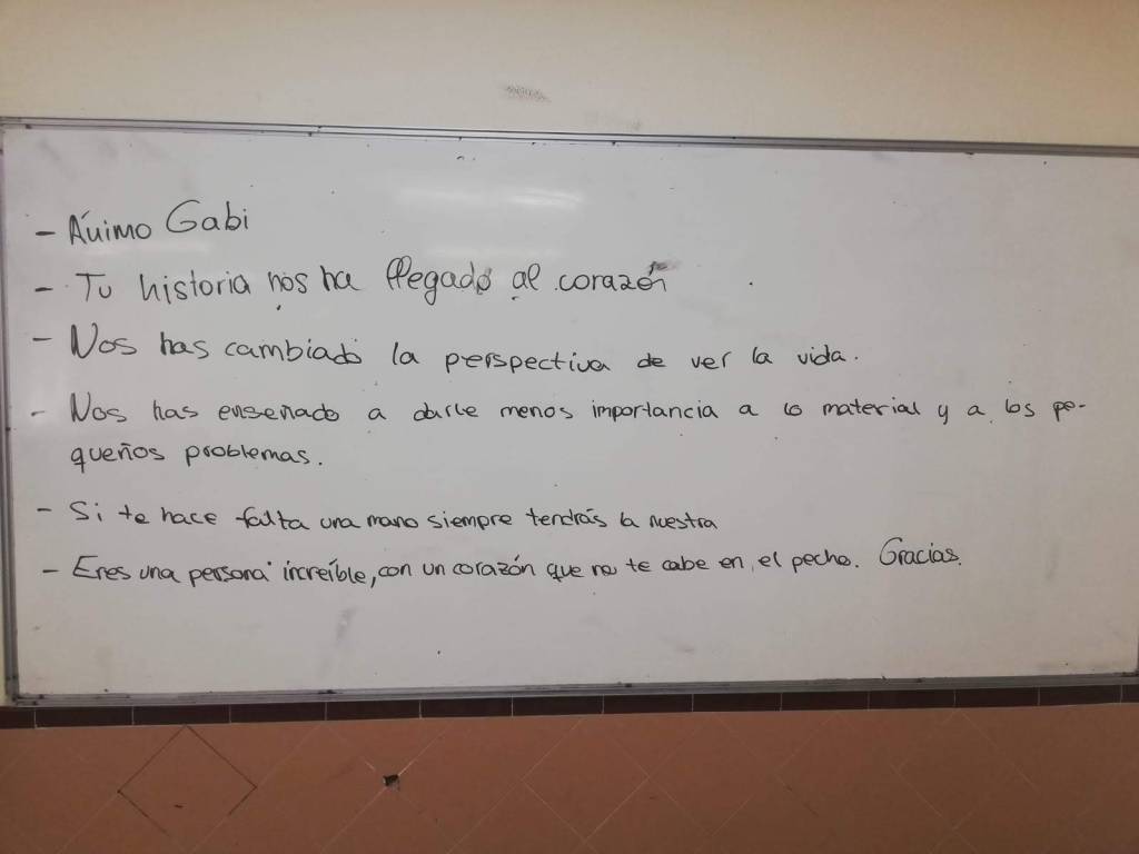 6. Buenas noches Gabi, soy uno de esos alumnos a los cuales ayudaste mucho dejando una pequeña parte de ti en esa charla, estoy utilizando entre otras cosas el consejo de dar un abrazo a la primera persona que veas al llegar a casa, la sonrisa de mi madre es única. Vuelvo a repetirte lo mismo que te dije al final de aquella charla, muchísimas gracias por abrirte tanto con nosotros y contarnos una experiencia horrible la cual conviertes en un viaje más. Te deseo lo mejor que te pueda pasar, un fuerte abrazo